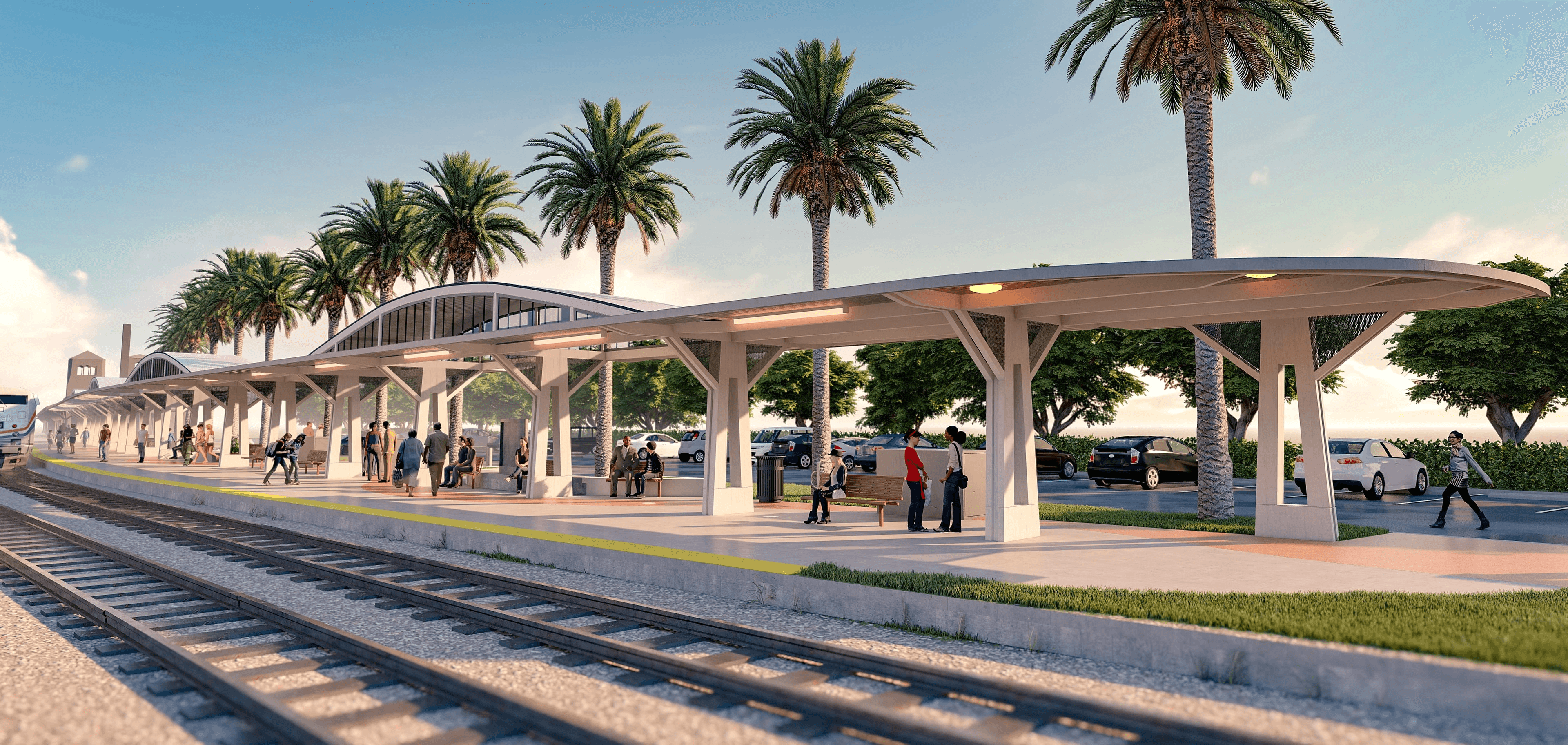 The architecture strikes a careful balance between functionality and placemaking. Palm trees and soft landscaping frame the platform zone, creating a distinctive Floridian character that connects passengers to the local environment. Large glazed sections in the canopy structure invite natural light while maintaining visibility and safety. The platform area includes integrated seating, lighting, and pedestrian pathways that prioritize comfort and accessibility. Altogether, the station’s design emphasizes durability, clarity of movement, and a civic-minded presence in the urban landscape—positioning it as a future-ready gateway for multimodal transit in West Palm Beach.