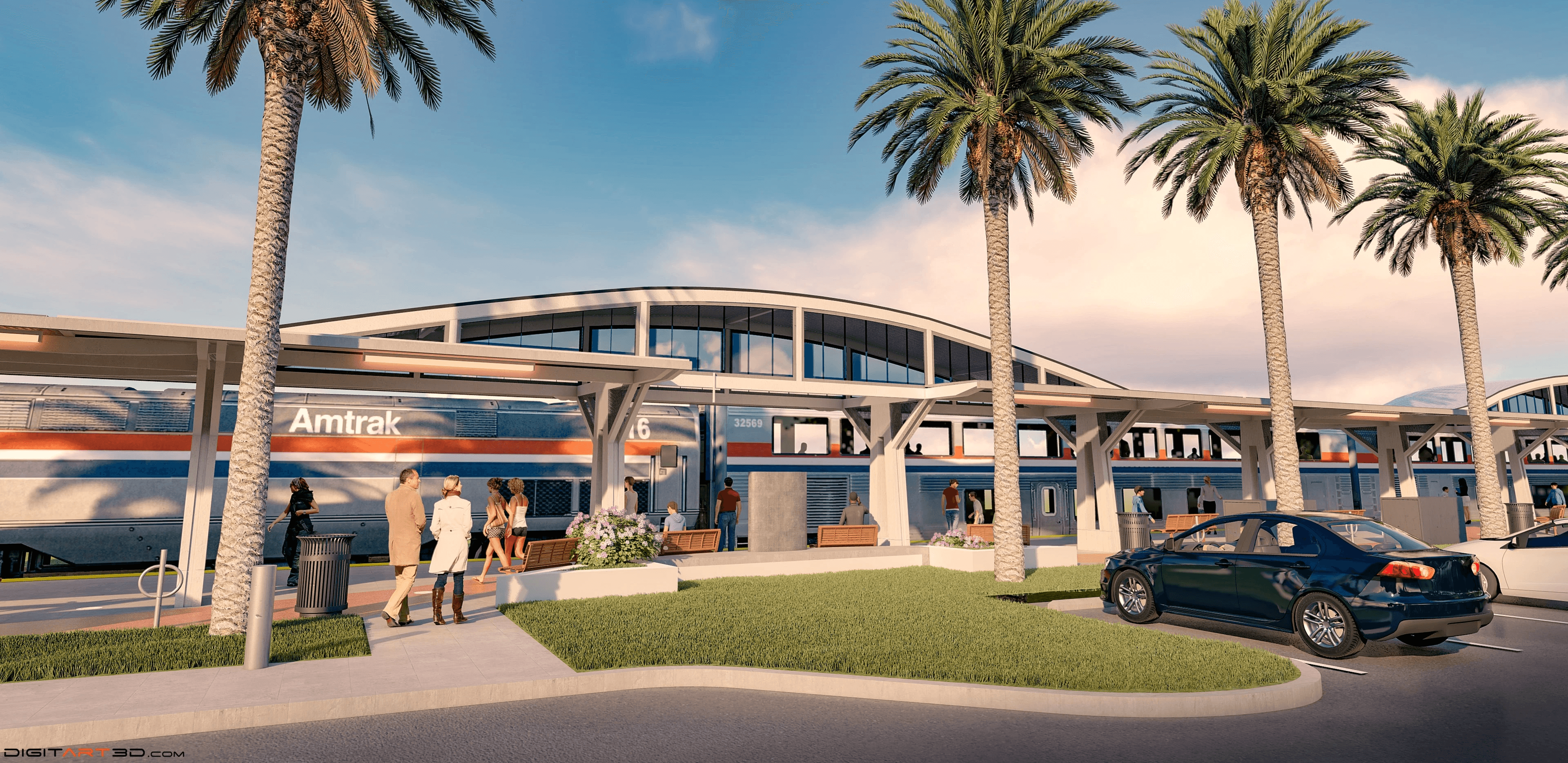 The Amtrak Downtown Station in West Palm Beach is a contemporary transportation hub that integrates clean architectural lines, tropical landscape elements, and public-oriented spatial planning. The design is defined by a series of gently arched roof forms that allow for daylight to filter into the station, visually lightening the large-scale canopy structure and offering a sense of movement that echoes the flow of rail travel. Generous overhangs supported by angled concrete columns provide shaded outdoor waiting areas while enhancing structural rhythm and transparency along the platform edges.